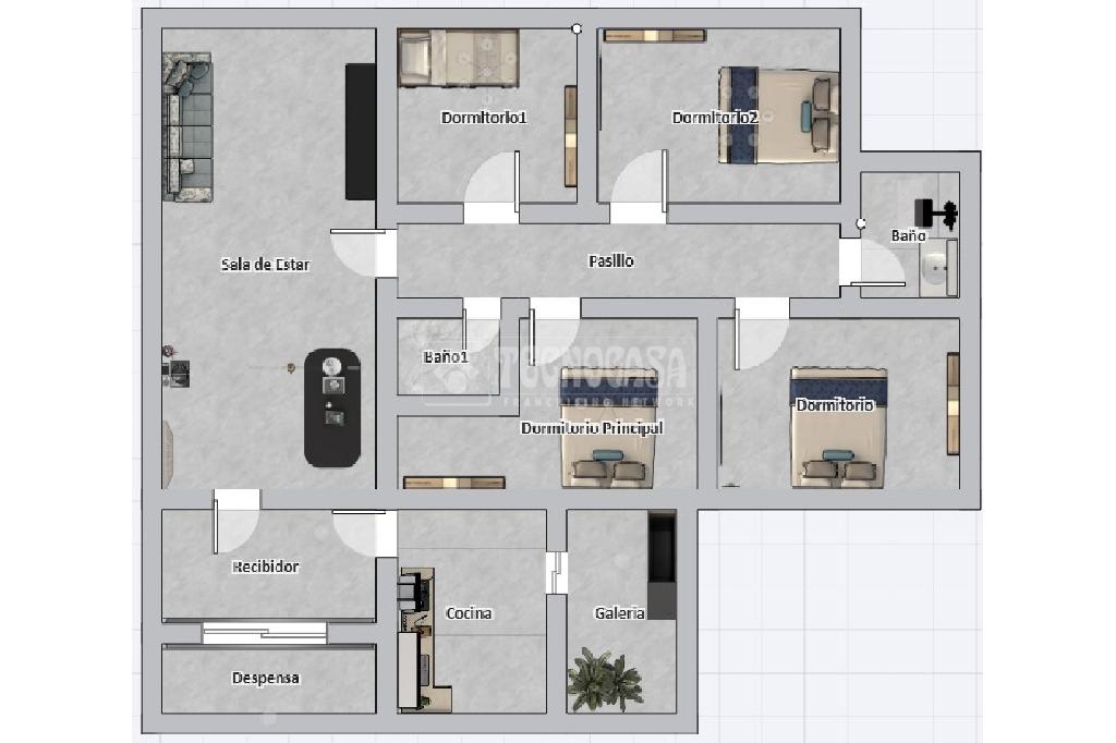 La vivienda se distribuye de la siguiente manera: Entrado en la vivienda encontramos una FABULOSA COCINA CON UNA GALERÍA EXTERIOR, a mano izquierda se nos descubre un AMPLIO SALÓN de más de 25 m2 con todas las comodidades, lleva incluido un SPLIT de aire acondicionado. Siguiendo por el pasillo principal damos paso a 4 FABULOSAS HABITACIONES, 3 de ellas AMUEBLADAS y una destinada a VESTIDOR. ASI MISMO el piso cuenta con DOS BAÑOS, uno de ellos usado como ASEO y el más grande, ubicado al final del pasillo, está TOTALMENTE REFORMADO con plato de ducha.